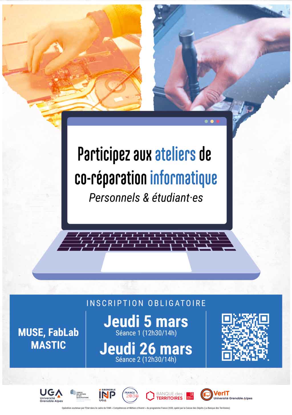 Dans le cadre des actions en faveur du numérique responsable et du réemploi du matériel informatique, des ateliers de co-réparation d'ordinateurs sont proposés aux personnels, étudiantes et étudiantes de l'Université Grenoble Alpes et ses établissements-composantes.