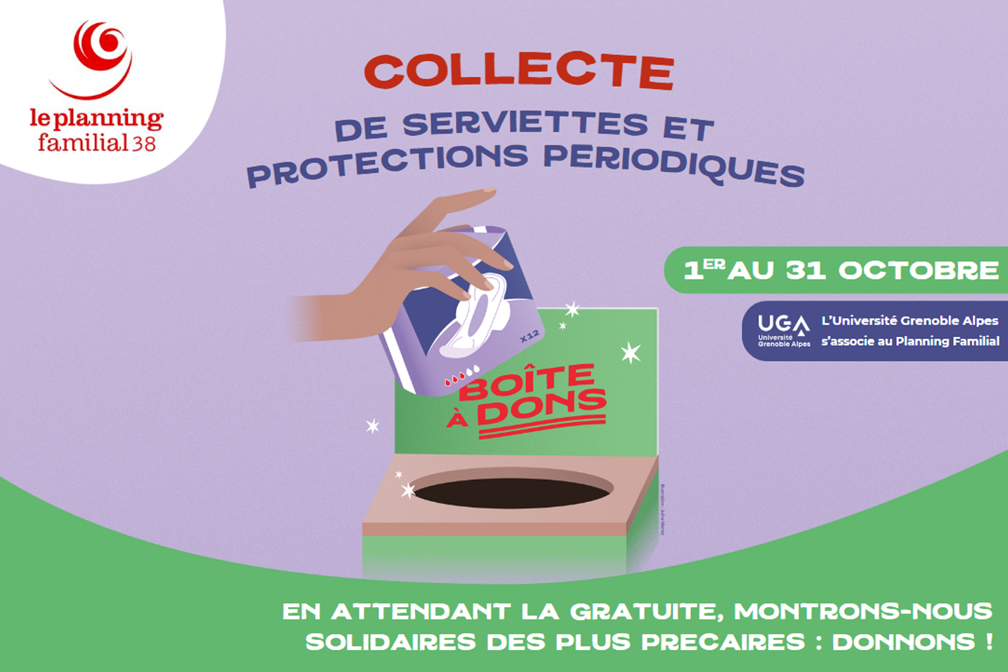 Dans le cadre de ses engagements contre la précarité menstruelle, l'UGA organise en association avec le Planning Familial 38 une grande collecte de protections et serviettes périodiques à destination de sa communauté universitaire à Grenoble. Cette année, chaque service ou composante peut organiser sa propre collecte!
